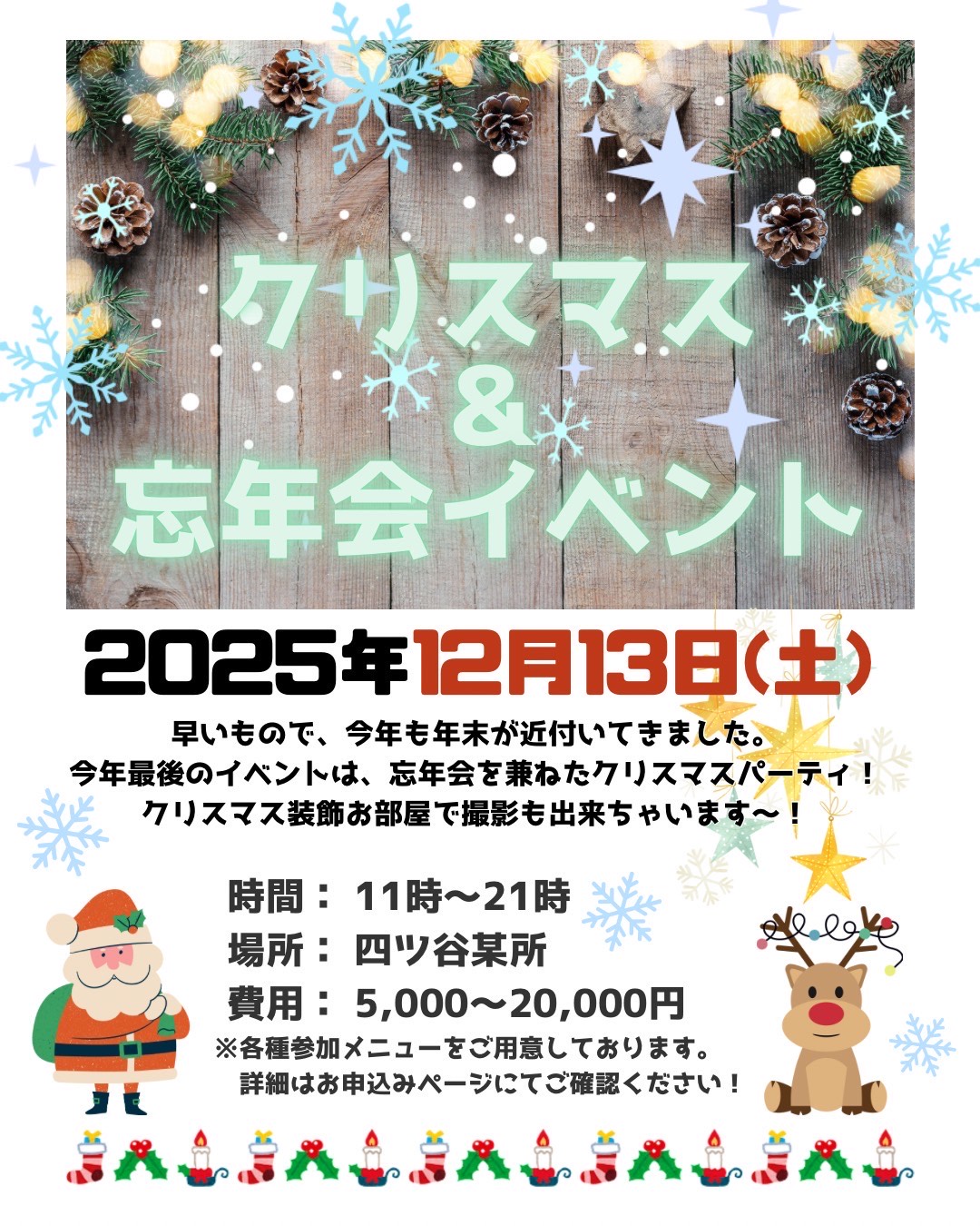 今年最後のイベントは「クリスマス&忘年会イベント」!!クリスマス装飾のお部屋での写真撮影と、夜は忘年会としてお食事をご用意してます!お時間があれば、是非ご参加ください!(^^)!